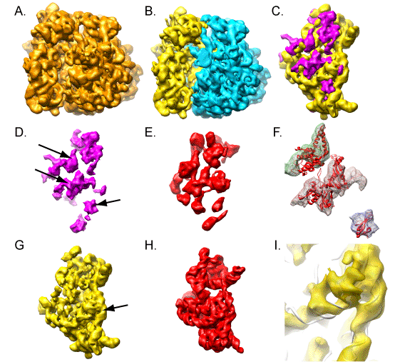The segmented density for the protein (D) and RNA (G) is shown next to the protein (red, E)