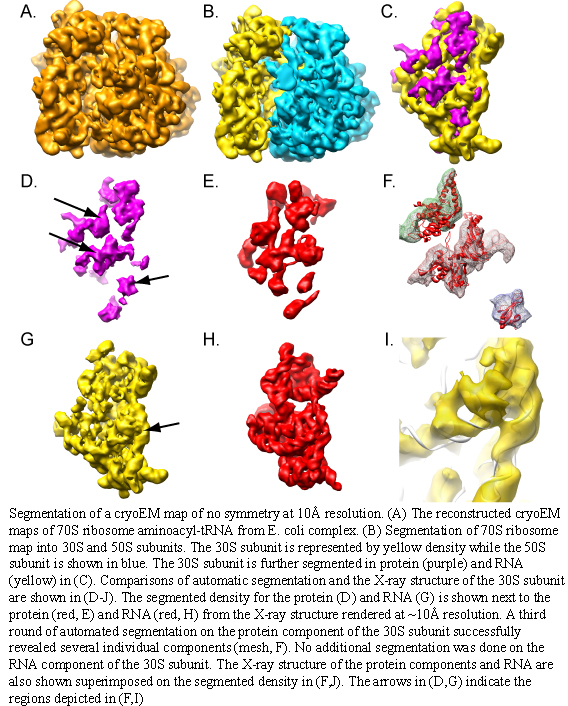 Comparisons of automatic segmentation and the X-ray structure of the 30S subunit are shown in (D-J).