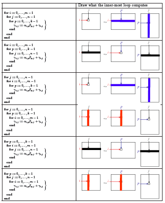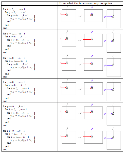 There are three choices for the outer-most loop: \(i \text{,}\) \(j \text{,}\) or \(p \text{.}\)