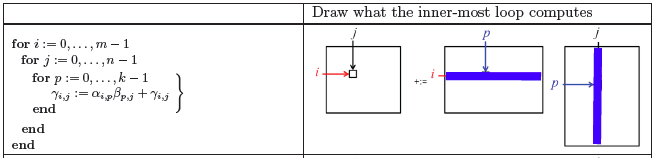Given that we now embrace the convention that \(i \) indexes rows of \(C \) and \(A \text{,}\) \(j \) indexes columns of \(C \) and \(B \text{,}\) and \(p \) indexes "the other dimension," we can call this the IJP ordering of the loops around the assignment statement.