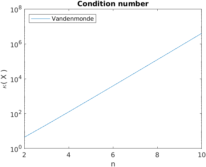 Assignments/Week03/answers/ShiftedLegendre.m. (Assignments/Week03/answers/ShiftedLegendre.m)The graph of the condition number, as a function of \(n\) is given by