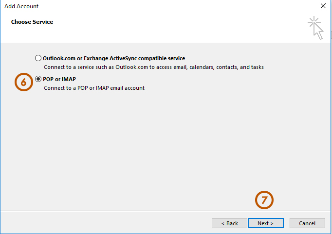 6. Choose POP or IMAP. 7. Click Next. |