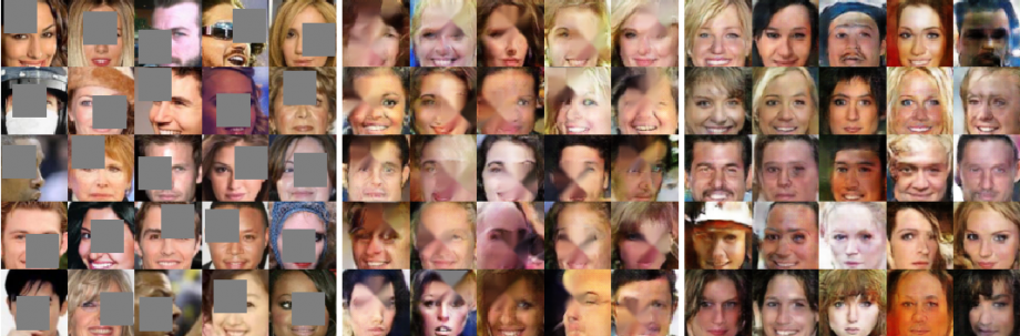 Research from UT professors and TRIPODS members Alex Dimakis and Eric Price shows that it is possible to learn a deep generative model that dreams images of human faces (right panel), trained by observing only occluded images (left panel). The middle panel shows a previous approach for solving this problem, that fails. [Figure from: AmbientGAN: Generative models from lossy measurements, by A. Bora, E. Price and A.G. Dimakis, ICLR 2018.]