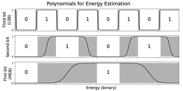 Each horizontal layer represents the value of a bit in the binary expansion of the energy. The horizontal layer at the bottom of the graph represents the Most Significant Bit (MSB) and the highest layer represents the Least Significant Bit (LSB). The polynomials that indicate the bits need to jump up and down at different speeds.