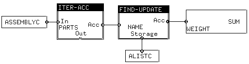 First click on Language and select the desired language. Then click Program; position the box, then select ASSEMBLYC and PARTS. Position the small box to the left of the larger box. Click on the Acc button of the larger box, then select SUM and WEIGHT and position the box to the right of the larger box. Then click Done.