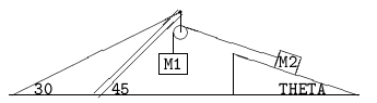 Two masses are connected by a cable as shown in the figure. The strut is held in position by a cable. The incline is smooth, and the cable passes over a smooth peg. Find the tension in the cable for theta = 30 degrees and m1 = m2 = 20 kg. Neglect the weight of the strut.