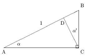 An advantage of such diagrammatic operators is that they can be used locally by making simple mental transformations such as translation, rotation, and reflection to make the diagrammatic operator match the existing diagram. Intermediate results that are written on the diagram become available for subsequent use, so that a chain of such operations can be used. For example, in the problem of Figure 3, the sine rule can be applied to the large triangle to find that BC = sin(alpha) ; this value can then be used as input to a cosine rule for the smaller triangle sharing the side BC to find CD = sin(alpha) * cos(alpha).