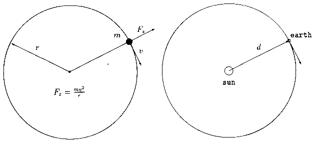 These diagrams (Figure 6) immediately suggest the correct correspondences: the sun corresponds to the center of the circle, the earth to the mass (suggesting that the earth be ``coerced'' to a point mass), the radius r to the earth-sun distance d , and the velocity v to the velocity of the earth along its orbital path (which then becomes a subproblem to be solved).