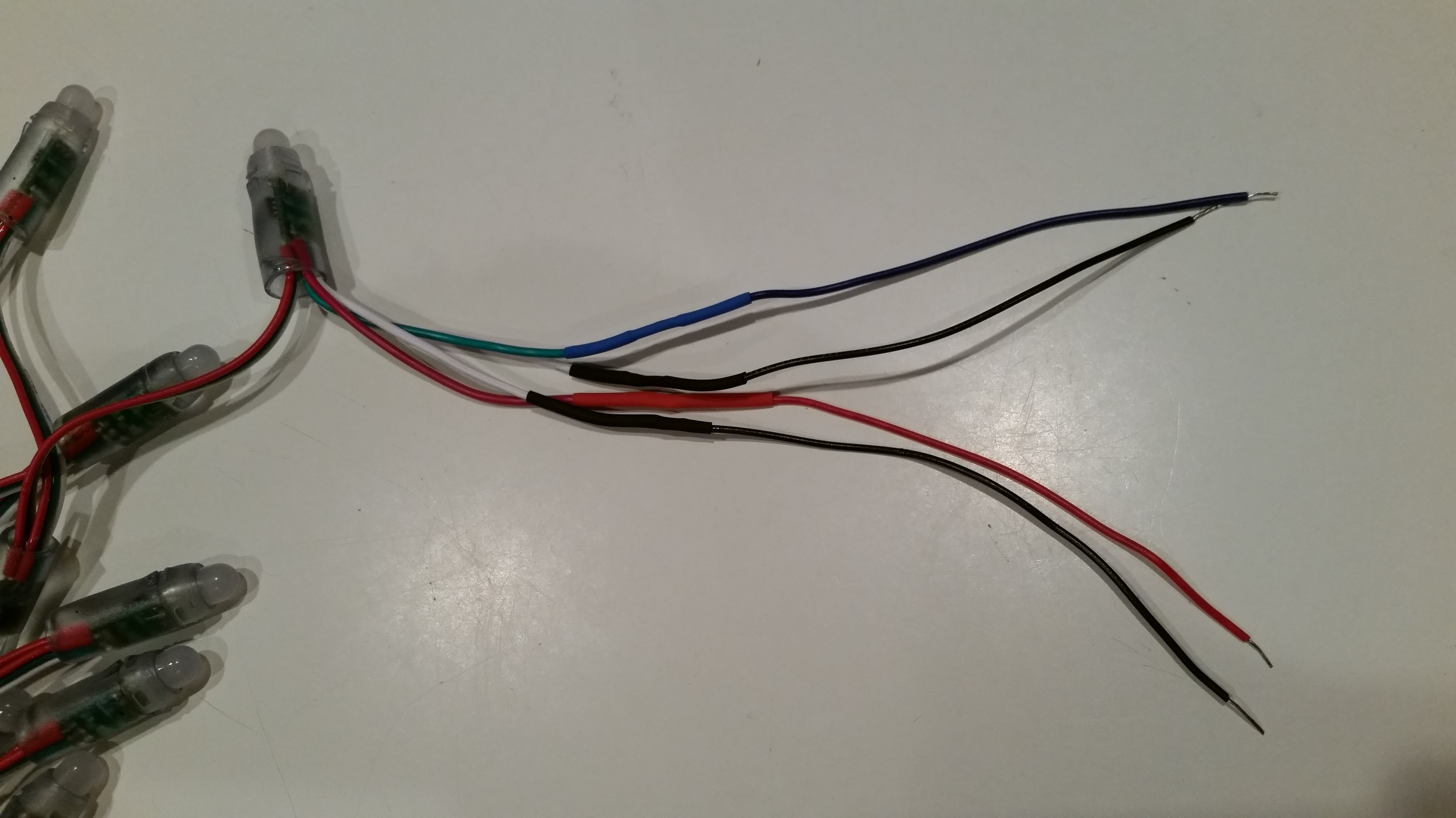 You should now have four independent wires---one white data wire, one red power wire, and two blue ground wires. Note that the colors in these lights do not quite match those in the picture. In the picture, white is ground and green is data.