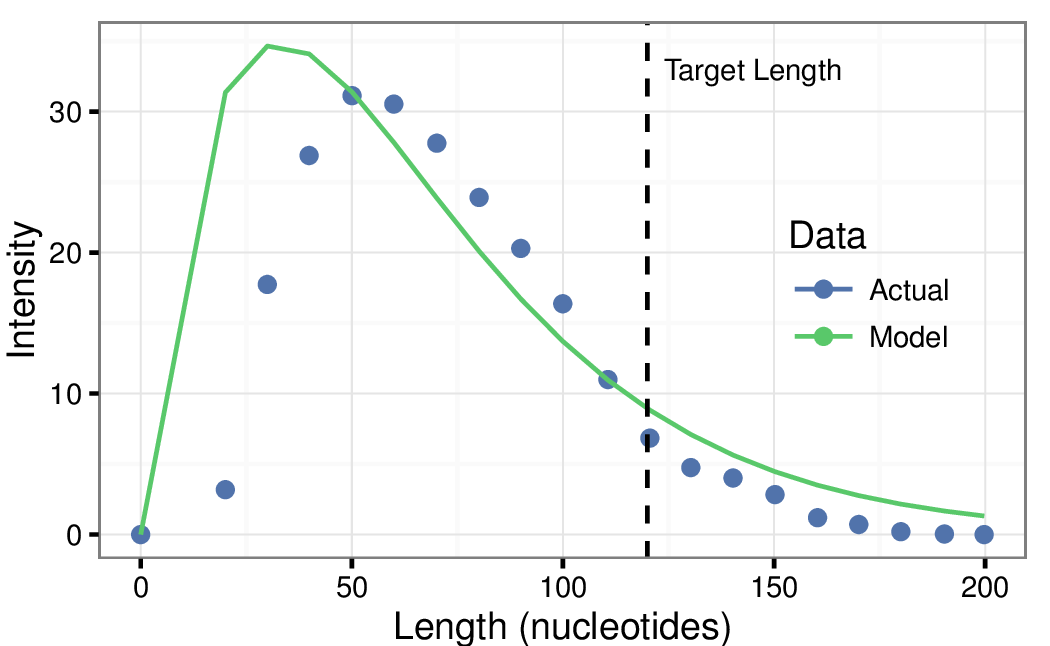 Expected and observed distributions of strand length from DNA synthesis. Sequencing recovers only strands of the target length, but most of the synthesis product is not full length.