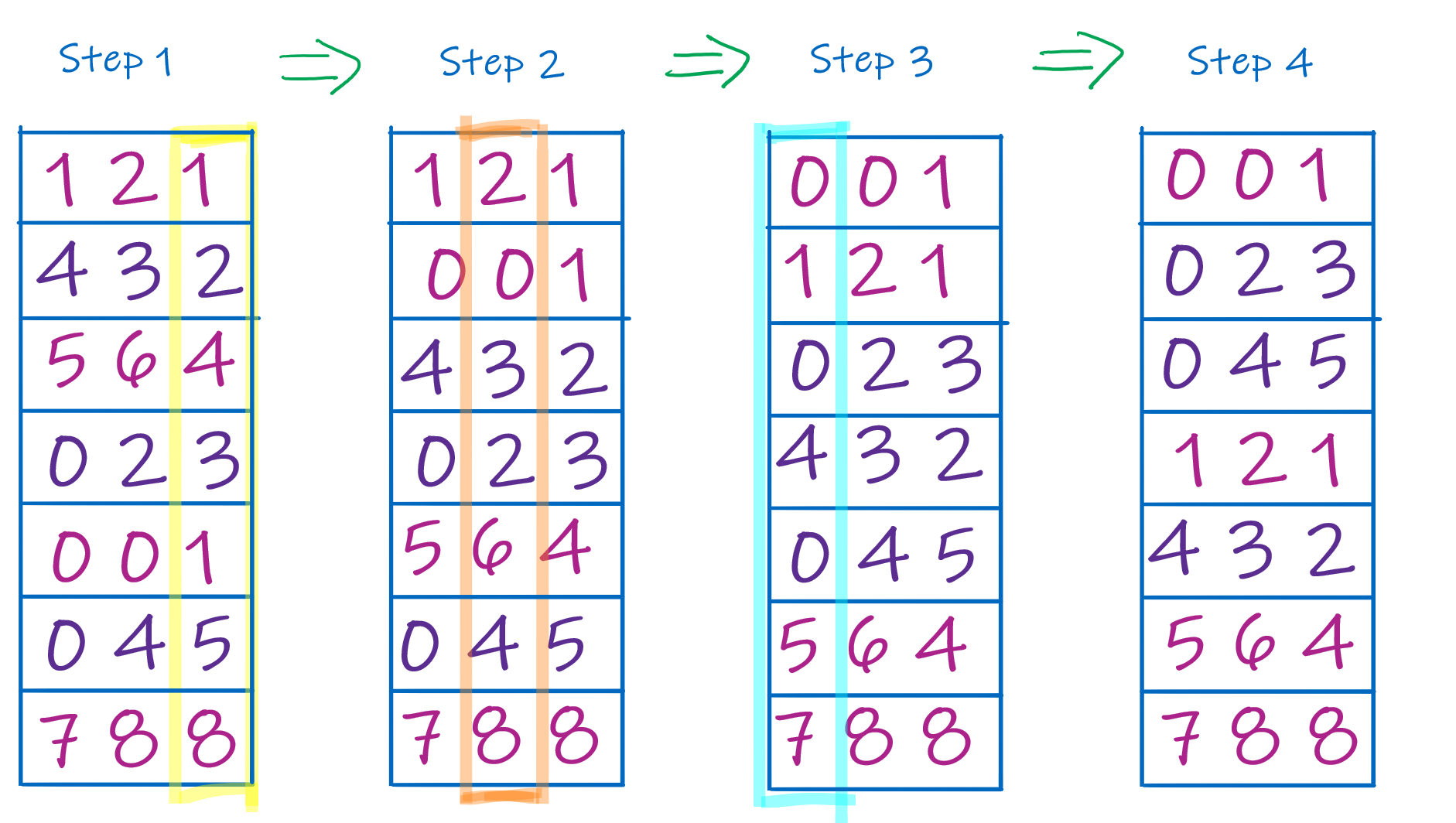 Given a list Data to sort containing non-negative integers of at most n digits. For rnd in range( n ): Generate a list sortLists of 10 empty lists; for each item in Data: append item to sortList[d], where d is the rnd digit of item, or d is 0 if item has no digit in the rnd position flatten sortLists to generate a new version of Data Return the final flattened listStrictly speaking, you don't have to flatten after each round, but I find it easier to see what's happening.