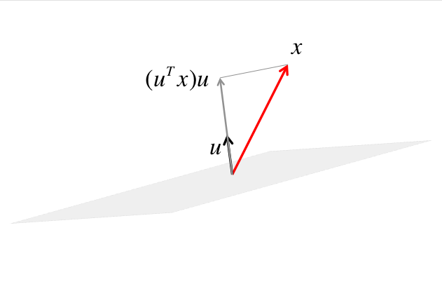 The orthogonal projection of \(x \) onto the mirror is then given by the dashed vector, which equals \(x - (u^Tx) u \text{.}\)