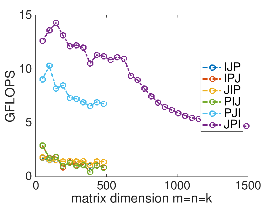 ¶Last week, you compared the performance of a number of different implementations of matrix-matrix multiplication. At the end of Unit 1.2.4 you found that the JPI ordering did much better than the other orderings, and you probably felt pretty good with the improvement in performance you achieved: