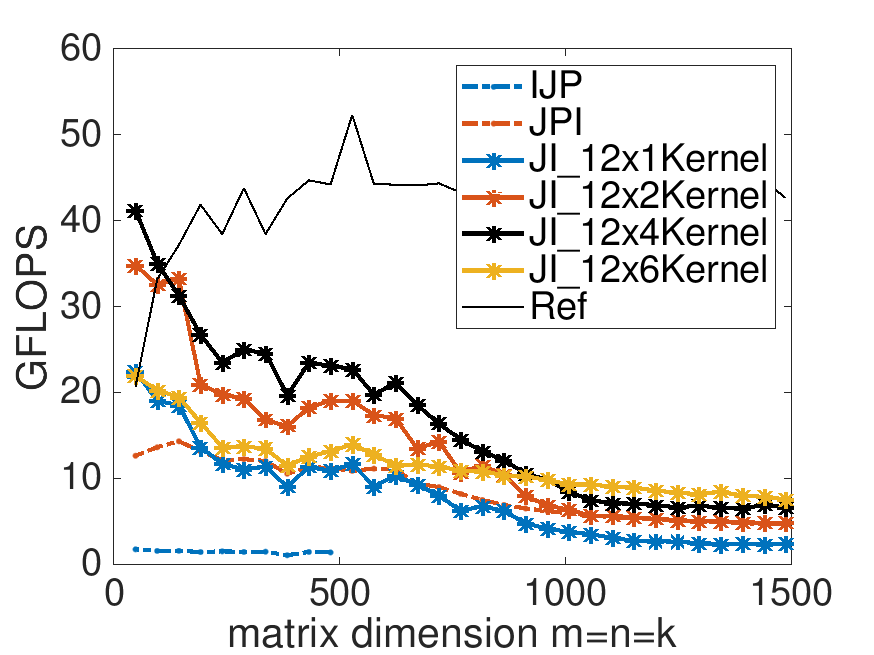 At this point, you have already implemented the following kernels: Gemm_4x4Kernel.c and Gemm_8x4Kernel.c. Implement as many of the more promising of the kernels you analyzed in the last homework as you like. Your implementations can be executed by typing
