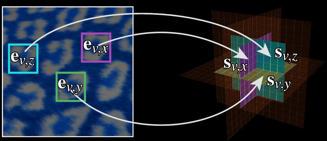 For each voxel we consider three axis-aligned neighborhoods. We search for the closest match to each neighborhood in the 2D texture. We refer to the best match in the 2D texture as an exemplar.