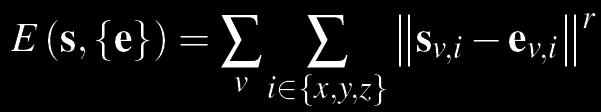 The energy function that is minimized during the search phase, where sv,i is the neighborhood aligned with axis i at voxel v and ev,i is the matching exemplar from the 2D texture. Here ||...|| represents the L2 norm and r is a constant used for numerical stability.