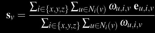 The weighted average used to update each voxel, where sv is the voxel to be updated, eu,i,v are the exemplar pixels found in the search phase, and ωu,i,v are the weigths calculated in the search phase.