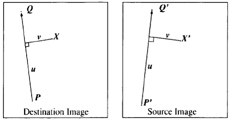 Feature based image morphing consists of two steps — image warping and cross-dissolving. During image warping, the source image is transformed into the destination image by specifying an inverse transform which maps every pixel in the destination image to a pixel in the source image. This distorts the source image and this distortion can be controlled by specifying a pair of control lines. Following figure depicts how this distortion is obtained.