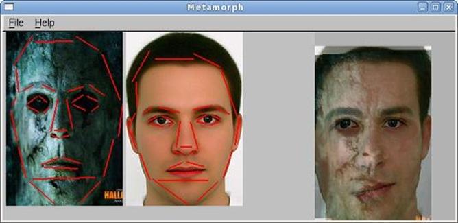Our system can automatically detect eyes, nose and mouth within faces and also the boundaries of the faces. Control lines are automatically drawn for each of the detected features. The detection mechanism is very simple, e.g. mouth is located approximately at one third of the height of the face from the bottom of the face. Since these are approximate locations, we also provide the user to adjust these lines to their correct positions. After clipping the faces, morphing is applied only to these regions. As shown in the figure below, this greatly improves the quality of morphing.