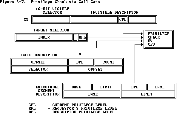 To take advantage of the processor's checking of RPL, the called procedure need only ensure that all selectors passed to it have an RPL at least as high (numerically) as the original caller's CPL. This action guarantees that selectors are not more trusted than their supplier. If one of the selectors is used to access a segment that the caller would not be able to access directly, i.e., the RPL is numerically greater than the DPL, then a protection fault will result when that selector is loaded into a segment register.