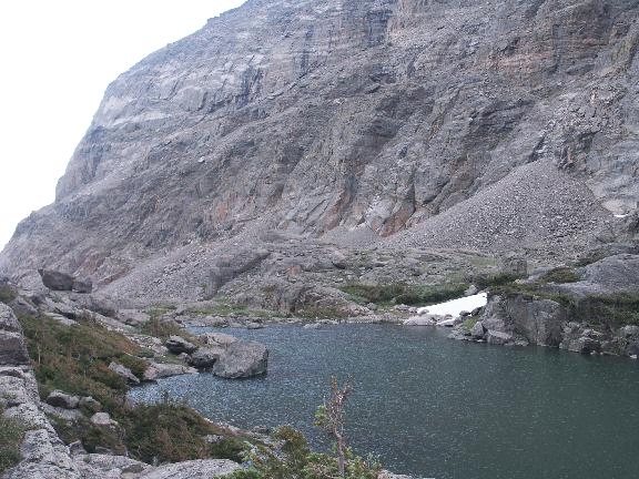 Lake of Glass is seen looking E, with cliffs of Thatchtop beyond.