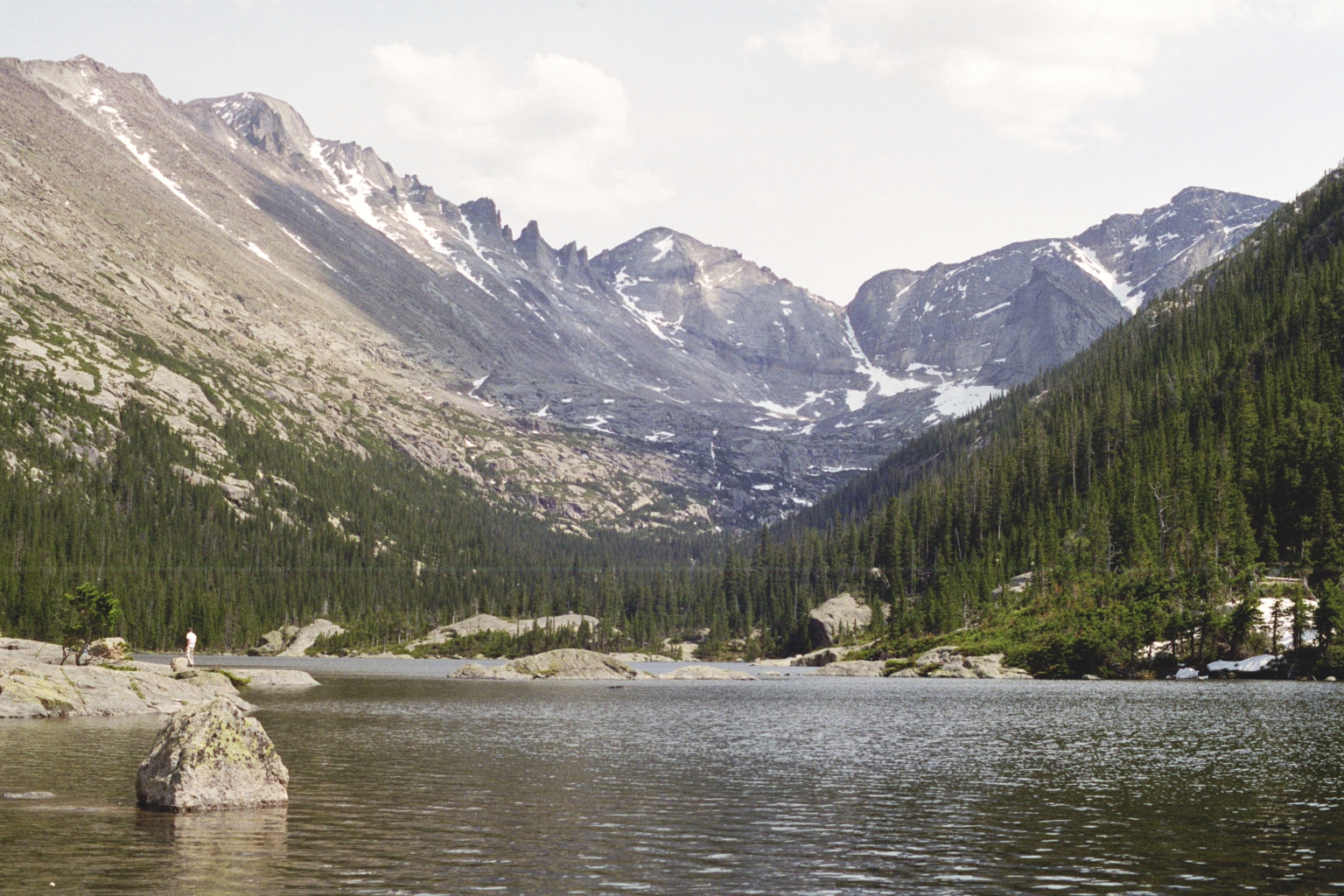 The spectacular backdrop of Mills Lake, looking S, includes Longs Peak (left), the Keyboard of the Winds, Pagoda Mountain (center), and Chiefs Head Peak (right) with Spearhead below it. Mills Lake is only about 2.4 miles from the Glacier Gorge trailhead; it is one of the best hikes in the Park for its distance.