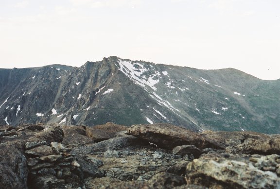 Hagues Peak is seen looking NE from Fairchild Mountain. Rowe Peak / Rowe Mountain is to the left of Hagues.
