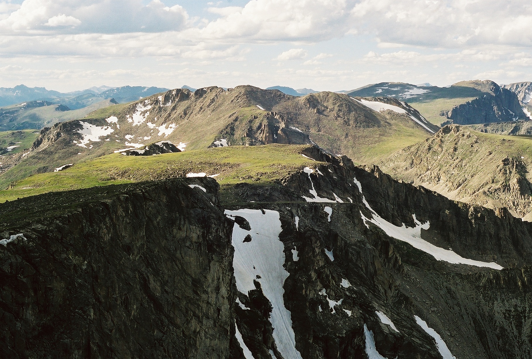 Looking north over the Cony Express to Isolation Peak (top center) from Ogalalla Peak. Ouzel Peak is visible as the green ridge in foreground. Mt. Alice and McHenrys Peak are at top right, with Mahana Peak below them.