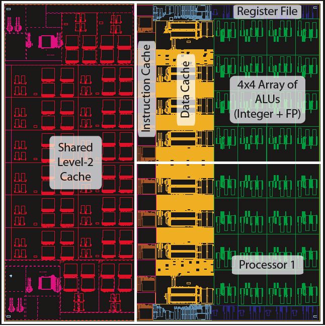 TRIPS Prototype SystemThe TRIPS project team is building a full system prototype to demonstrate the feasibility of this new technology. The prototype hardware consists of custom TRIPS chips mounted on custom TRIPS circuit boards. Each TRIPS chip contains two advanced processor cores that support the TRIPS EDGE architecture and 1 megabyte of on-chip memory. A TRIPS motherboard includes 4 TRIPS chips and 8 gigabytes of DRAM (2 gigabytes per chip). The entire TRIPS system is scalable to 32 TRIPS chips and 64 gigabytes. At the prototype target clock frequency of 500 MHz, the peak performance is 500 gigaflops. TRIPS Prototype ChipThe TRIPS prototype chip is a 170 million transistor custom ASIC designed in a 130nm technology. The UT-Austin TRIPS team partnered with IBM microelectronics for ASIC physical design, including placement, routing, and fabrication. Each of the two processor cores can execute up to 16 out-of-order operations (integer or floating point) per cycle, from a window of up to 1,024 in-flight instructions. The processor core is composed of multiple copies of five different types of tiles interconnected via microarchitectural networks. Each core may be configured in a single threaded mode or in a 4-thread multithreaded mode in which instructions from multiple threads may execute simultaneously. A TRIPS processor core is fundamentally distributed for technology scalability and to provide high bandwidth to the instruction cache, data cache, and register file through partitioning and replication. The chip also contains a 1MB level-two static non-uniform cache access (NUCA) memory system to keep the processor cores fed at high data bandwidth. The NUCA system is composed of 16 64KB memory tiles interconnected via an on-chip network fabric. Individual memory tiles may be configured as a part of the cache or as a part of physically mapped memory. The memory netork also includes two direct memory access (DMA) controllers, two DDR DRAM controllers, and a network controller to connect gluelessly to adjacent TRIPS chips. The diagrams below show a fabricated chip in a 47mm square package, a floorplan of the TRIPS chip colorcoded to highlight the distinct tiles, and a detailed chip plot. Click on each diagram to see a larger version.